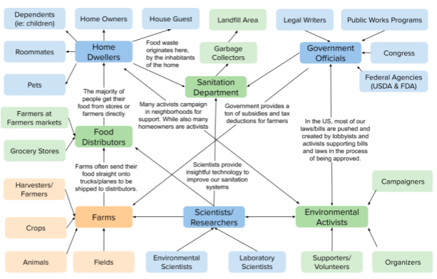 To see how all these stakeholders were connected and had an influence on food waste, I created a stakeholders map